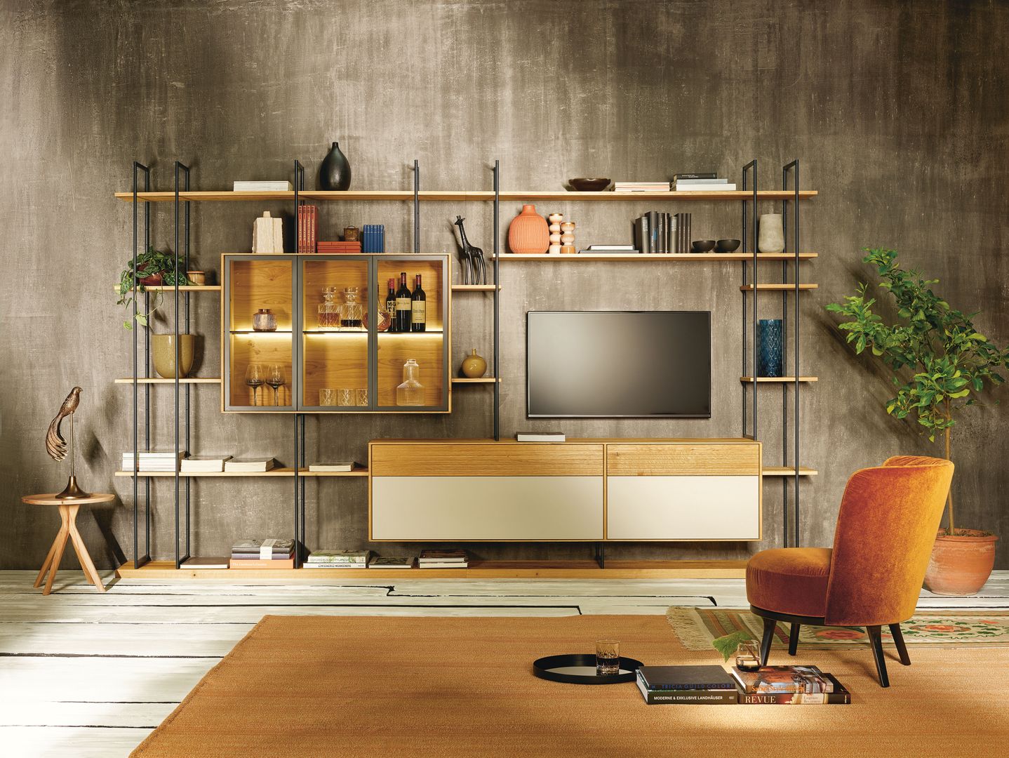 Im Wohnzimmer darf es auch ein bisschen mehr sein. Purismus ist das Eine, der topaktuelle Trend nach üppiger Deko das Andere. Es muss nicht immer schlicht sein und weniger ist auch nicht immer mehr. Deshalb halten auch wieder Samt, Seide und Brokat Einzug in unsere Wohnzimmer. Dazu gesellen sich warme Holztöne bei Regalen, Kommoden, Vitrinen und TV-Möbel.